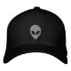Cuatro cabezas alienígenas bordadas rodean esta fresca tapa de cabeza alienígena.