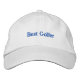Gorra mostrado en blanco con el texto bordado en azul: Mejor Golfer. Personalizar este artículo o compra tal cual.