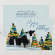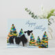 Tarjeta de Navidad del Border Collie en el árbol de Navidad de la nieve invernal. Tranquilo paisaje invernal nevado con un adorable border collie blanco y negro y coloridos árboles de Navidad. Feliz Navidad en una fuente de moda. Tarjeta de vacaciones para un dueño de border collie. Puedes cambiar el texto o borrarlo.