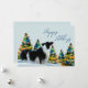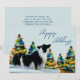 Tarjeta de Navidad del Border Collie en el árbol de Navidad en nieve invernal. Tranquilo paisaje invernal nevado con un adorable border collie blanco y negro y coloridos árboles de Navidad. Feliz Navidad en una fuente de moda. Tarjeta de vacaciones para un dueño de border collie. Puedes cambiar el texto o borrarlo.