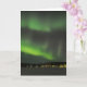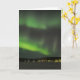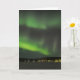Tarjeta de felicitación con los rayos verdes de los borealis de la aurora (aurora boreal) en el cielo nocturno sobre un lago congelado en Laponia.