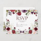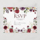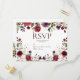 Esta hermosa y romántica postal RSVP de color burdeos floral, florida y florida, ofrece una magnífica colección de flores borgoñas, moradas, melocotones y blancas, y una hermosa vegetación y helechos. En la parte inferior del diseño y en la parte posterior se ha colocado una disposición similar, y el elegante texto de estilo moderno de la invitación personaliza el diseño en el medio, con un elegante estilo burdeos y negro. No se incluye ningún menú en esta versión. Parte de un conjunto de bodas coincidentes. Copyright Elegant Invita. Todos Los Derechos Reservados.