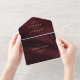 El Boda de caligrafía de oro y agat de Borgoña All in One Invitation está diseñado con una postal RSVP fácil de desgarrar. Simplemente dobla cada tarjeta en la forma delineada y luego sella y envía - no se necesita ningún sobre para el envío. Para una mayor personalización, haga clic en el enlace "personalizar adicional" y utilice nuestra herramienta de diseño para modificar esta plantilla. Si necesita ayuda o elementos coincidentes, por favor contáctame.
