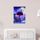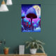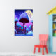 Un gran bosque de champiñones donde se pueden encontrar grandes setas moradas, cielo azul, nieve e invierno y luna en el cielo. Este es un arte generado por IA