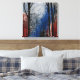 Esta vibrante obra de arte representa una densa escena forestal utilizando una técnica gráfica única que recuerda a la estampación de linocut. Los árboles se ilustran en blanco y negro, con líneas gruesas y planas que contrastan con un fondo dinámico de texturas de color azul, rojo y negro. La composición crea una sorprendente yuxtaposición entre los árboles monocromos y el colorido fondo abstracto, dando a la imagen una mezcla de belleza natural y de estilo artístico.