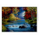Pintura de un río con pequeños rápidos en un bosque de principios de otoño.