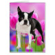 Terrier de Boston Blanco y Negro sobre un fondo de tulipanes rosados.