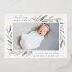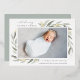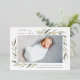 Elegante anuncio botánico de nacimiento en colores pastel de moda presenta una única foto horizontal o paisajística de sangrado completo con cúmulos de delicadas hojas de acuarela de primavera pálida en las esquinas, acentuadas con Relieve metalizado dorado. Personalice con el nombre del bebé, las estadísticas de nacimiento y un mensaje personal, y agregue tres fotos cuadradas adicionales a la parte posterior.