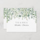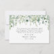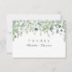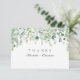 Esta Tarjeta de Agradecimiento de Boda Botánica de Eucalipto Verde - cuenta con exuberante vegetación en cascada de ramitas de eucalipto, hojas sobre el fondo blanco pálido con texto de letra moderna. El reverso de la tarjeta también es blanco con hojas de eucalipto y mensaje de agradecimiento.