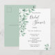 Una moderna ducha de novia en blanco y verde. Un fondo blanco de moda en la parte delantera. Decorado con estribos botánicos verdes y vegetación, follaje. Guión moderno de gran tamaño con letras a mano, tipografía con el texto: Bridal Shower. Plantillas para el nombre de la novia y detalles del fiesta. Texto gris oscuro. Atrás: fondo verde. Sugerencia: Si no desea que se vea como una postal, haga clic en personalizar, vaya a la parte posterior y quite el separador y el sello postal.