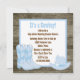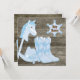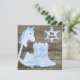 Adorables invitaciones rústicas de madera de granero con botas vaqueras azules, sombrero de vaquero, insignia de sheriff y pony de palo para baby shower de niño vaquero. Agregue sus detalles en el frente y/o en la parte posterior al comenzar a agregar los detalles del evento, estilo de fuente, tamaño y color de la fuente, y redacción.
