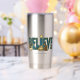 Fun tumbler with a beautiful nativity scene in the word "Believe" complete with baby Jesus in a manger, Mary, Joseph, shepherd, sheep and a donkey. What a nice cup to fill with a hot beverage. Great gift idea for the Christians you know this Christmas.