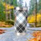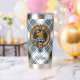 Insignia escudo del Clan Forbes rodeada de una correa y hebilla sobre un fondo escocés. Texto personalizado en ambos lados.