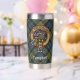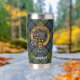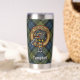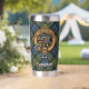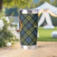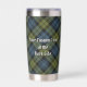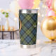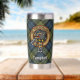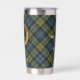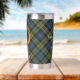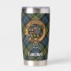 Insignia de Campbell escudo rodeada de una correa y hebilla sobre fondo tartán. Texto personalizado en ambos lados.