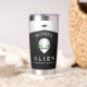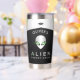 This personalized tumbler features a sleek metallic alien face with glowing green eyes and a minimalist UFO motif, combining sci-fi style and bold contrast in black, silver, and neon green tones.