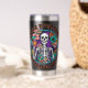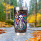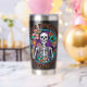 A funny, sarcastic, and colorful design showcases a skeleton clutching a steaming mug of coffee, surrounded by vibrant flowers. The bold text humorously declares, "I hate everyone, but coffee helps." This unique design is available on a wide variety of products, making perfect gifts for coffee lovers.