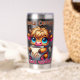 A funny and sarcastic design showcases a cute highland cow with big blue eyes, sitting contentedly in front of a vibrant daisy while holding a steaming cup of black coffee. The cow's soft brown fur adds to its charm. Bright, colorful text reads, "Inhale caffeine, exhale negativity." This delightful design is available on a variety of products, making perfect gifts for coffee enthusiasts.