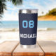 Crea tu propio personalizado, personalizado, fresco, moda, a la moda, elegante, moderno, elegante tipografía azul claro y blanco / fuente / guión, 20 oz, doble pared de aislamiento para retención de temperatura, duradero, azul marino oscuro, acero inoxidable de primera calidad monocromático nombre jersey número de tumbler térmico que mantiene tus bebidas calientes calientes y tus bebidas frescas frescas frescas, todo manteniendo tus manos cómodas. Simplemente teclee tu nombre / nombre de niño / nombre del jugador y número de camiseta del jugador, al personalizar. Perfecto para tus bebidas calientes y frías favoritas, bebidas de salud, batidos, té, café, sopa, etc y para el campo deportivo, caminatas, camping, trekking, escuela, universidad, hogar, oficina, ir al gimnasio, asistir a una reunión de negocios, o disfrutar de un picnic en el parque, piscina o playa en verano, alrededor del fuego o en la montaña en invierno. Hace un gran regalo para boda, cumpleaños, graduación, día del padre, Día de la Madre, navidades, vacaciones, aniversario de matrimonio, día de San Valentín, de vuelta a la escuela, y más, para sus seres queridos, hijos, novia, novio, mamá, papá, hijo, hija, hermano, esposo, esposa, abuelos, equipos, compañeros de equipo, atletas, jugador, entrenador, deportistas, amigos y familia.