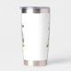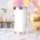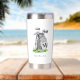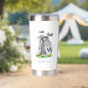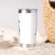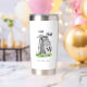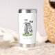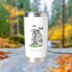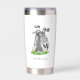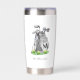 This elegant travel mug features a stylish gray watercolor golf bag filled with clubs, surrounded by a touch of green grass. The design appears on both sides of the mug for easy viewing. A simple serif font initial monogram is placed directly on the golf bag, blending seamlessly into the overall design. Below the monogram, the full name is displayed in a matching serif font for a classic and personalized touch. The monogram is currently in a dark gray, almost black, to match the bag's accents, but it can be customized to any color you prefer.