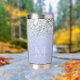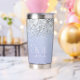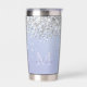Lavanda lujosa morada con vaso de purpurina de plata holográfica aislado. Personalízalo fácilmente con tu nombre inicial. Hace un regalo personalizado único. (c) El estudio Happy Cat Studio.
