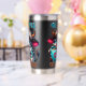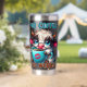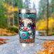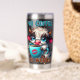 A funny and sarcastic design features a cute highland cow sitting with a steaming coffee mug that has a lipstick kiss mark on the front. The cow, with big blue eyes, glasses, and a soft expression, has black and white fur. Bright, colorful text reads: "No coffee, no workie." This playful design is available on various products, making perfect gifts for coffee lovers.