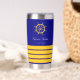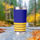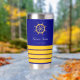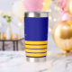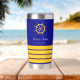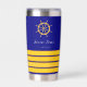Un fondo azul marino clásico. Decorado con volante de oro falso y 4 rayas de capitán. Personalice y agregue el nombre del barco.
