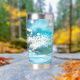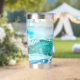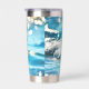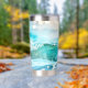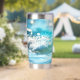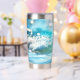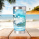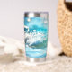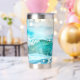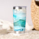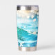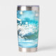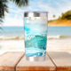 Tumbler termal con una alegre ola brillante en la playa de alegres colores turquesa.