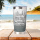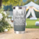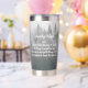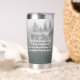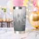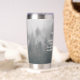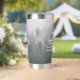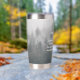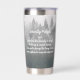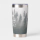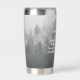 Un tumbler termal, de moda, de acero inoxidable para tu bebida caliente o fría que incluye una imagen de foto envolvente de un bosque neblinado, nebuloso y siempre verde junto con las palabras inspiradoras del Orador de la Serenidad impresas en escritura blanca y estilizada.
