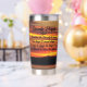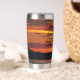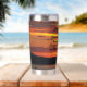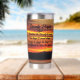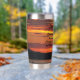 Un tamborilero térmico, de moda, de acero inoxidable para tu bebida caliente o fría que incluye una foto panorámica de un atardecer dramático y naranja junto con las inspiradoras palabras del Orador de la Serenidad impresas en escritura negra y estilizada.