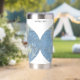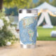 A soft pastel relief world map wraps around the bottle, showing land elevation and ocean depth through gentle color gradients and shaded terrain. Based on ETOPO global elevation data, a widely used cartographic dataset, the design represents the shape of the Earth both above and below sea level. The “Adventure awaits” prompt and name field can be customized or removed, making it a thoughtful personalized gift for travel and map enthusiasts.