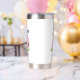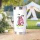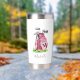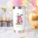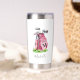 This cute travel mug features a stylish pink watercolor golf bag filled with clubs, sitting on a patch of green grass. The design appears on both sides of the mug for easy viewing from any angle. A simple serif initial monogram is placed directly on the bag, seamlessly blending into the artwork. Beneath the monogram, the full name is shown in elegant script typography for a personal touch. The monogram is currently in a dark gray, almost black, to match the bag’s accents, but you can change it to any color you prefer.