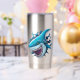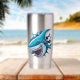 Shark's Mouth: The most striking feature is the open mouth filled with rows of sharp teeth. The teeth are depicted in white against the darker purple interior of the mouth, creating a stark contrast that emphasizes the aggressive nature often associated with sharks.