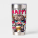A funny, sarcastic, and colorful design showcases an adorable highland cow with big blue eyes, brown fur, and a sad expression, holding a steaming cup of coffee and a daisy. The vibrant text reads, "You can't make everyone happy, you are not coffee." This charming design is available on a variety of products, making it a perfect gift for coffee lovers.