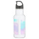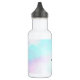Botella de agua con un diseño moderno de acuarela abstracta. Los colores azul y violeta se mezclan y se mezclan en un suave patrón abstracto de color pastel.