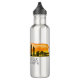 Elegante botella de agua de acero inoxidable presenta la silueta de la línea de horizonte de la ciudad de Austin Texas con salpicaduras de color de agua al atardecer y coordenadas del mapa de latitud y longitud