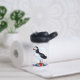 Ave marina de Aluminio Atlántico, con su plumaje blanco y negro típico y su pico de colores vivos, sobre una roca, en el océano. Ilustracion vectorial original Copyright BluedarkArt TheChameleonArt.