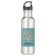 Botella de agua personalizada con un fondo verde silencioso en la parte superior es un árbol amarillo claro con dos siluetas de pájaro naranjas sentadas en las ramas.