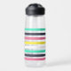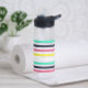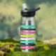 Una bolsa colorida con un patrón a rayas. La bolsa es principalmente blanca con rayas horizontales en gris, rosa, amarillo, turquesa y negro.