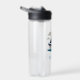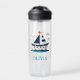 Esta botella de agua personalizada cuenta con una bonita vela azul y blanca.