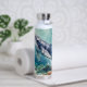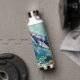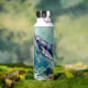 A oceanic themed water bottle with a beautiful illustration of an impasto style whale swimming deep in the sea by vibrant colorful coral. A really beautiful coastal art. Colors used are teal, blue and soft coastal colors.