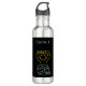 Botella de agua personalizada para los amantes del bingo, con gráficos de la línea de Bingo Nocturno de color amarillo neón y azul sobre fondo negro.