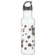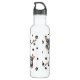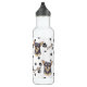 Esta botella de agua muestra el retrato de un artista de un adorable chihuahua negro y moreno. La imagen se repite alrededor del perímetro de la botella y se coloca sobre un fondo salpicado de huellas de pata negra. Su nombre u otro texto en castaño también se repite alrededor del perímetro.
