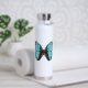 Botella de agua de mariposa azul con un dibujo digital que muestra la belleza y elegancia de una de las criaturas más impresionantes de la naturaleza - la mariposa de Morfo Azul. La obra de arte captura la esencia de las alas azules iridiscentes de la mariposa. El fondo de las obras es sencillo, con un blanco acolchado que contrasta con el azul vibrante de las alas de la mariposa. Es una adición perfecta a la colección de los amantes de la entomología y del arte de los insectos y un tributo a la impresionante belleza del mundo natural.