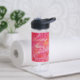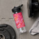 Rosa caliente, Naranja y dorado remolino en este estilo romántico y moderno. El tallo único de acacia dorada amarillo adorna la esquina inferior y el centro de la parte posterior. Pinturas de color luminosas en un giro abstracto. El frente celebra a la novia y al novio, el reverso puede ser personalizado para miembros importantes de la familia o miembros de la fiesta nupcial.