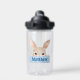 Esta adorable botella de agua de Pascua cuenta con un conejo acuático que sostiene un cartel de un punto polka azul. Personalice con el nombre de su hijo.