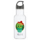 Una botella de agua personalizada con un ilustracion adorable de un cactus redondo de plumón, con grandes ojos de kawaii, sonriente y con sombrero rojo. Parado dentro de una maceta de flores.