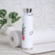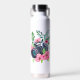 Flores rosas, follaje verde y botella de agua personalizada de la cámara de cosecha.