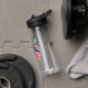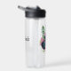 Flores rosas, follaje verde y botella de agua personalizada de la cámara de cosecha.