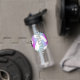Esta botella de agua con tema de voleibol para ella presenta la palabra "voleibol" orientada verticalmente sobre un colorido voleibol que tiene un degradado estilizado rosa / púrpura / azul - personalizado con el nombre del atleta y número de camiseta - por katz_d_zynes