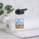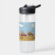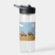 Botella de agua con un diseño de camiones y flores sobre un cielo de diseño de abejas en azul con un sol brillante y nubes/ El fondo es tostado. Se puede cambiar el nombre del frasco. Gracias a Creative Fabrica por algunos de los elementos del diseño.